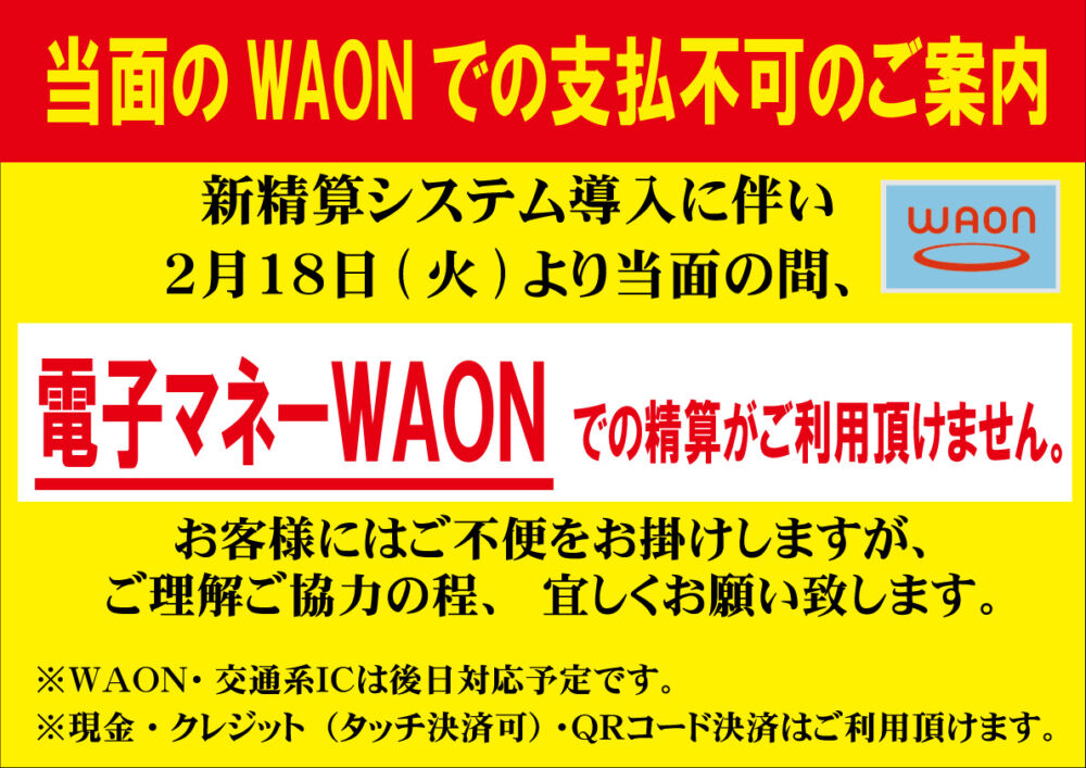 当面の間WAON決済利用不可のご案内